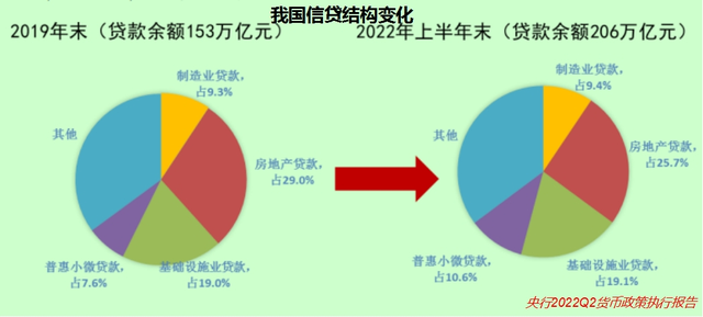 据央行2022Q2货币政策报告,2022年6月末206万亿元人民币贷款余额中,普惠小微、制造业、基建、房地产贷款大体占全部贷款余额的一成、一成、两成、两成半,其中,房地产贷款占比持续下降,普惠小微贷款占比稳步抬升。
