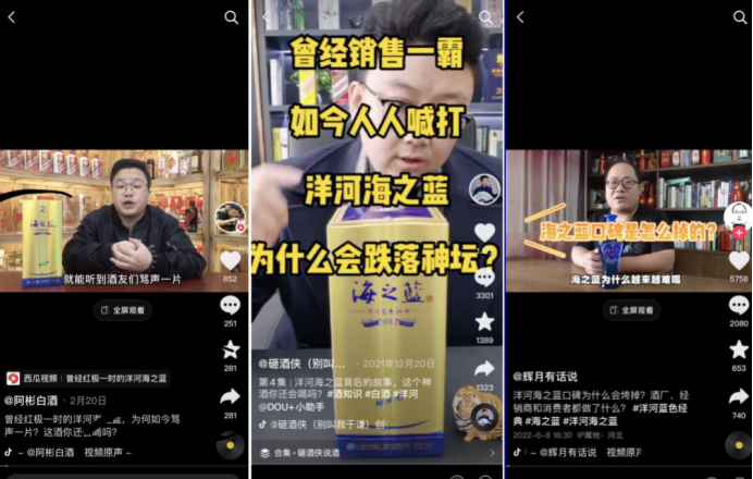 洋河的蓝色经典系列,最风光的时期是八九十年代,产品长期供不应求,但如今只要翻看社交网络,抖音、微博上对于海之蓝的印象,就能发现“酒质不稳定”、“第二天头疼”、“经销商混乱”等负面评价,酒类自媒体更是将“盘点海之蓝的衰落历史”作为账号保留节目。