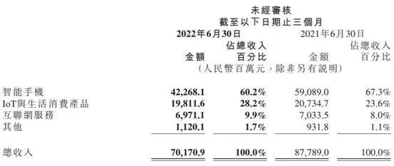 财报指出,智能手机收入和销量双降的主要原因是全球宏观经济环境的影响及中国大陆新冠肺炎疫情反覆。