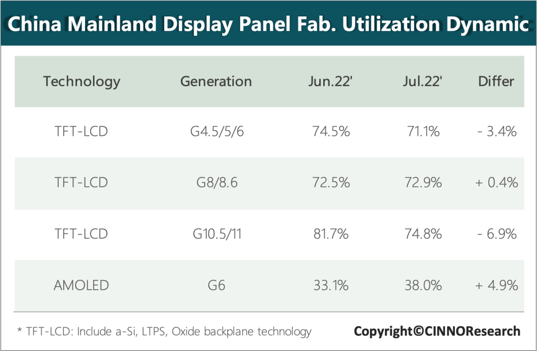 CINNO Research近日发布的数据显示,2022年7月国内LCD液晶面板的平均稼动率为73.3%(稼动率是指设备在所能提供的时间内为了创造价值而占用的时间所占的比重,数值下滑侧面反映工厂订单量减少),环比下滑2.3%,同比下滑21%。全球各大面板厂商7月份的平均稼动率为66%,除中国大陆地区以外的LCD面板厂商稼动率更是降至55%。作为对比,7月份国内OLED面板厂商的平均稼动率为41.6%,环比增长了4.5%。