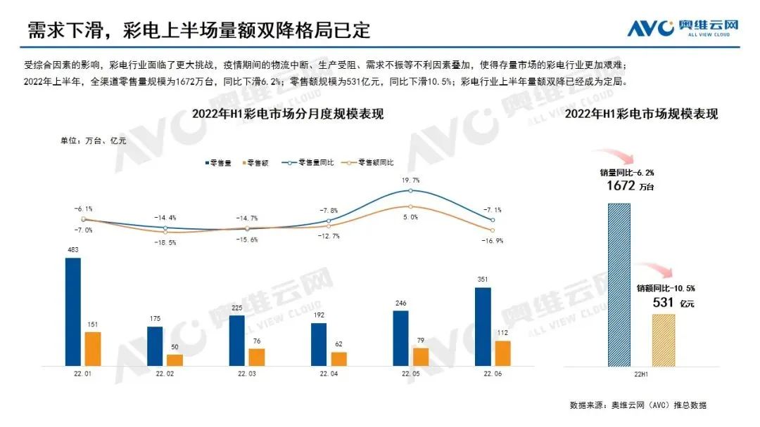 不过,全球彩电的绝大部分销量,其实都是美国和欧洲市场贡献的,和国内几乎没有太大的关系,因为国内彩电市场早就处于半饱和状态。奥维云网数据显示,2020年国内彩电销量为4450万台,同比下降9.1%;2021年销量为3835万台,同比下降13.8%;今年虽然只过去半年,但半年销量仅1672万台,同比下跌6.2%。从中能看出,国内彩电市场的景气度一年不如一年。