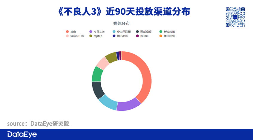 《不良人3》产品上线的初期阶段中,投放渠道相对集中。根据DataEye-ADX投放渠道显示,上线前90天,侧重于字节系渠道进行投放,抖音、今日头条、穿山甲联盟以及西瓜视频等四个渠道占比高达75%,并且以视频传播平台渠道为主。