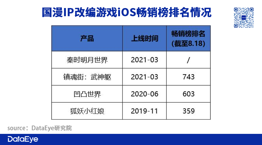 另外,DataEye研究院统计了近2年知名国漫改编游戏(部分)的畅销榜排名情况,基本排名在300名以外,其中《秦时明月世界》发布了关服公告——大多数国漫IP改编的表现并不理想。