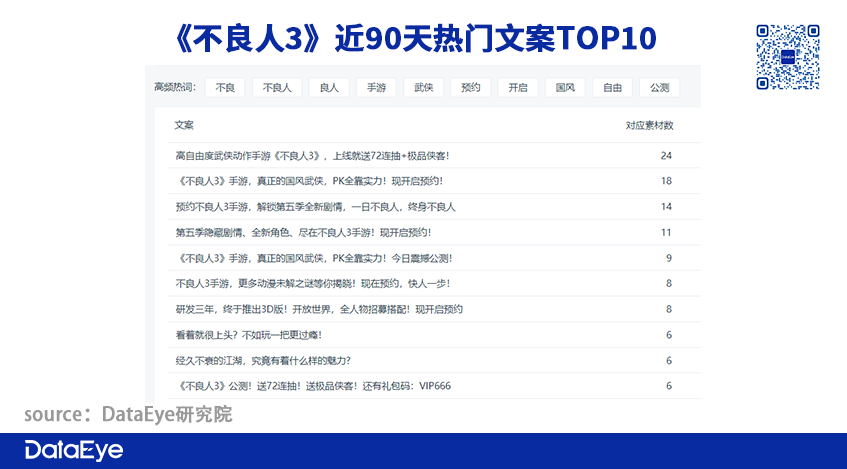 根据DataEye-ADX投放数据显示,《不良人3》近90天热门投放文案重点突出“不良人”、“武侠”、“国风”等词,主要是基于产品特点以及突出IP为主,同时“预约”、“公测”等时间节点关键高频词,以侧重突出产品的上线时间。