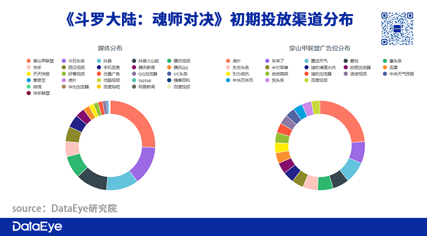相比之下,《斗罗大陆:魂师对决》在产品上线初期,不仅投放量大,而且渠道覆盖得更广。而相同点在于,《斗罗大陆:魂师对决》同样侧重于字节系投放渠道,而且视频渠道占比更高。