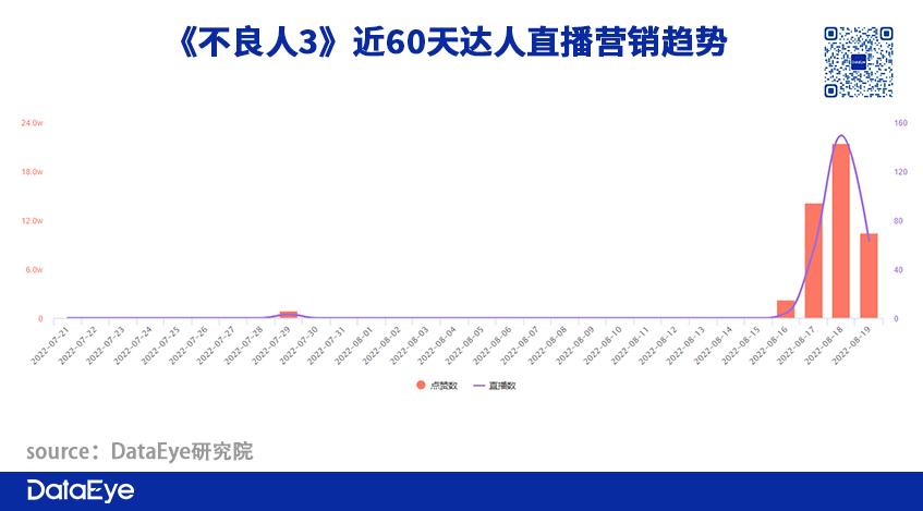 DataEye-ADX达人营销数据显示,《不良人3》在产品上线前后开启了效果型达人直播营销,而整体投入力度中等偏低。游戏上线当天直播数超过150场,并且整体效果不错,总点赞数达到峰值。