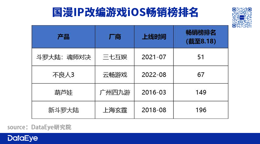 ②现状惨淡,优秀国漫IP改编游戏产品寥寥无几。从首日表现来看,《不良人3》整体表现不算抢眼,首日排名免费榜第二,而畅销榜进入TOP70。可是DataEye研究院根据iOS畅销榜排名进行梳理,发现榜单前200的国漫IP改编游戏数量较少,如下: