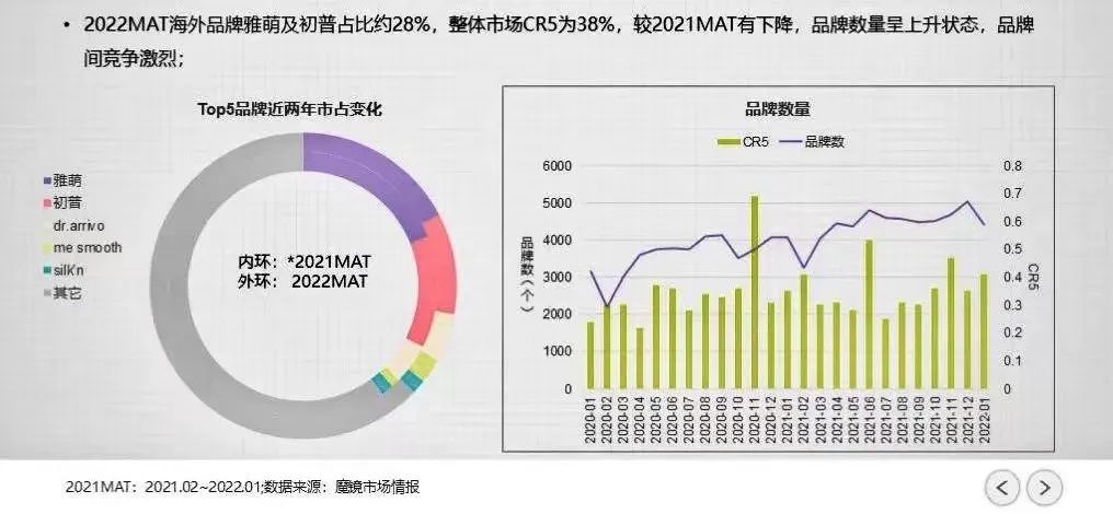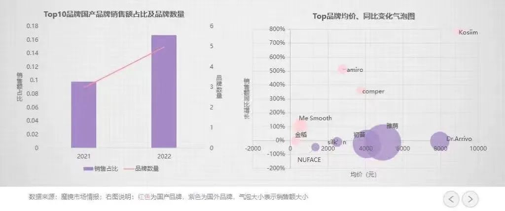 与此同时,国内美容院开始进入存量时代,踩中这一时间点的国产美容仪就此进入了爆发期,AMIRO、花至、mesmooth等更多新国产品牌开始出现在大众的视野里。魔镜市场情报显示,今年国产品牌的市场占有率又有了明显提升。