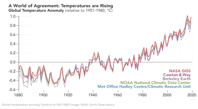 过去四十年,全球气候处在一个稳定的增温通道中 | 图源:NASA