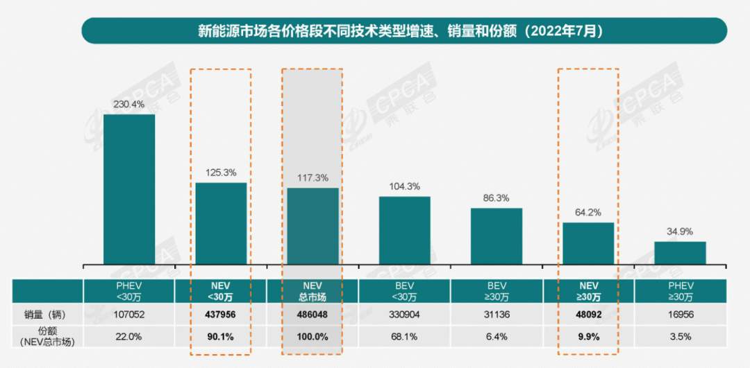 纵观新能源市场,7月份,在纯电车型里,30万元以上销量占比为9.9%,混动车型里其占比仅为6.4%。而且,参照燃油车市场的演变,新能源市场的销量结构后续也必定会走向“纺锤形”,即中端产品占据主流,高端趋向小众。