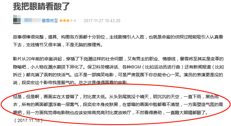 2017年犯罪影片《暴雪将至》上映,该影片此前在海内外多个电影节频频亮相,助力段奕宏摘得东京影帝,然而该影片内地最终票房仅2712万元,豆瓣评分7.0,表现平平,其中,负面声音最大的评价就是“画面太暗”所带来的糟糕观影体验。