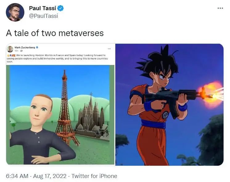 还有人拿 Horizon Worlds 和《堡垒之夜》比较。在《堡垒之夜》和《龙珠Z》的联动里,孙悟空可以在游戏里端起霰弹枪,精细的画面和放飞的想象力,似乎更贴近所谓的元宇宙。