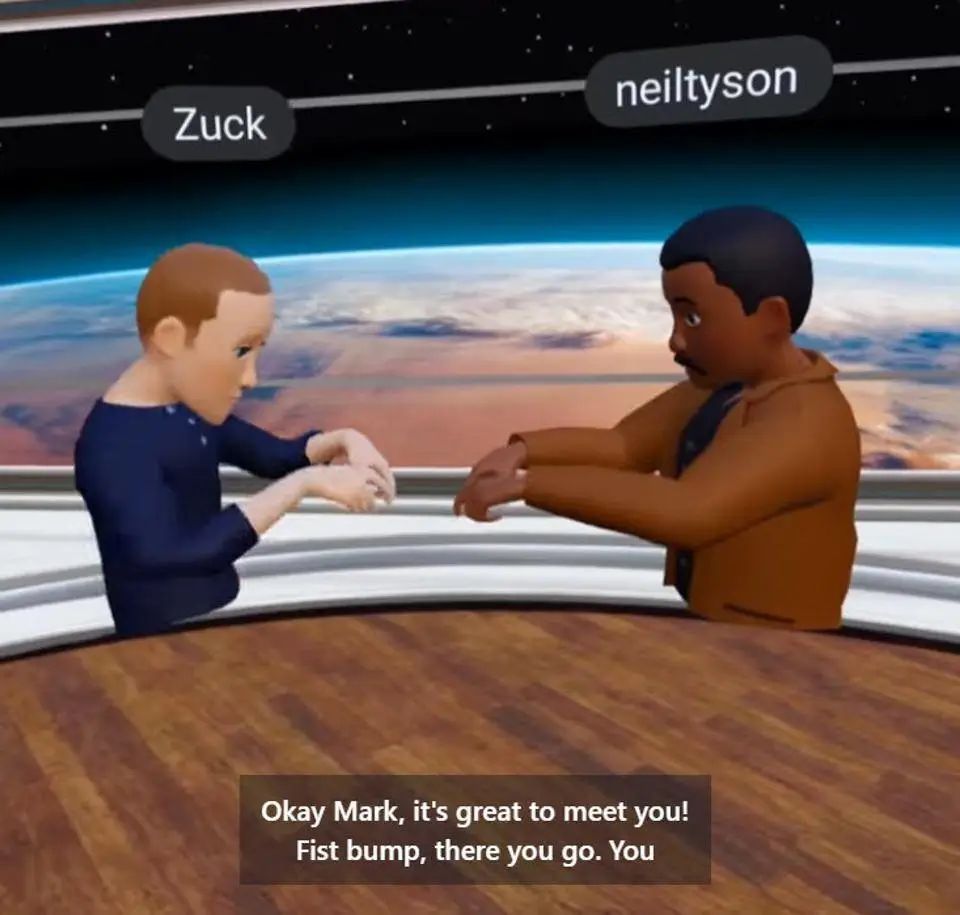 扎克伯格的元宇宙不是第一次被吐槽。7 月底,在他与天文学家 Neil deGrasse Tyson 对谈韦伯望远镜的第一张图像时,观众被他们的「手」吸引了目光——碰拳的两人尴尬地将手悬停在半空中。
