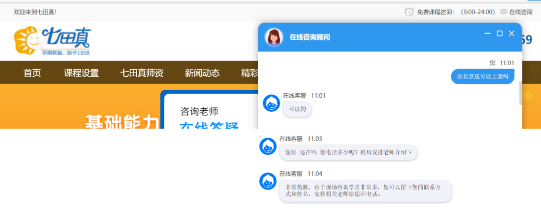 通过“思可教育国际集团”官网,燃次元进入到了“七田真国际教育”官方网站,在线客服聊天窗口随即弹出。当燃次元就“北京还能上课吗”咨询七田真官网客服人员时,对方回复表示,“可以的”,并多次要燃次元留下姓名和电话,以便安排老师进行详细的课程介绍。