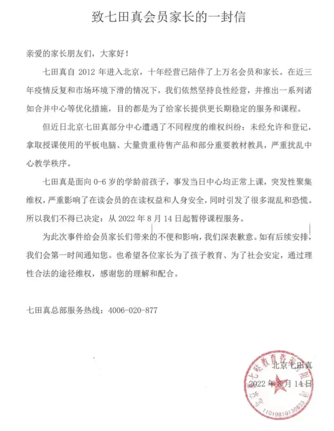 声明写道,“因北京七田真部分中心遭遇不同程度维权,严重扰乱教学秩序,不得已决定自8月14日起暂停课程服务。”