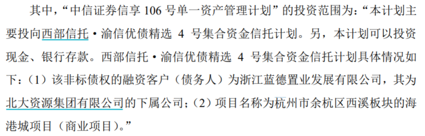 东方铁塔此前公告显示,东方铁塔在2020年4月出资5000万元购入了中信证券信享106号单一资产管理计划。该资管计划最终投向的是西部信托-渝信优债精选4号集合资金信托,后者债务人为北大资源下属蓝德置业,涉及项目正是杭州海港城项目。