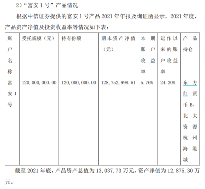 富安娜公告披露,中信证券提供的富安1号产品2021年年报及询证函显示,截至2021年底,该产品资产总值约为1.30亿元,资产净值约为1.29亿元,运作以来账面收益率24.2%,2021年当期收益率5.76%。