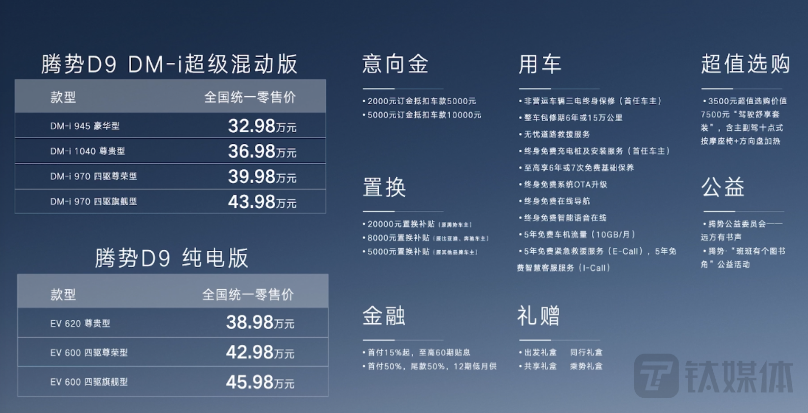 钛媒体APP 8月23日消息,新能源MPV腾势D9于今晚上市。新车在此前预售车型基础上增加了一款EV纯电版车型,共推出2个版本7款车型,售价区间为32.98万元-45.98万元,以及一款售价66万元的创始限量版车型。