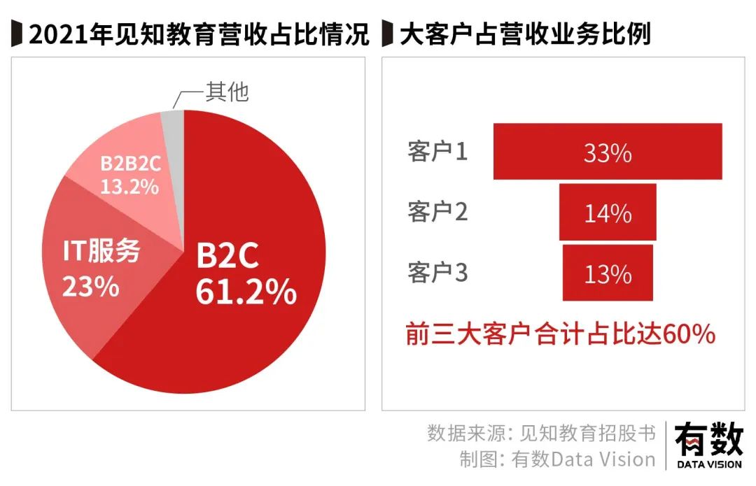 见知教育的招股书中,有一组令人疑惑的数据:根据2021年披露,公司超过60%的收入来源于B2C模式,但同样让人惊奇的是,做To C业务的公司收入依赖大客户,前三大客户合计占比达60%。
