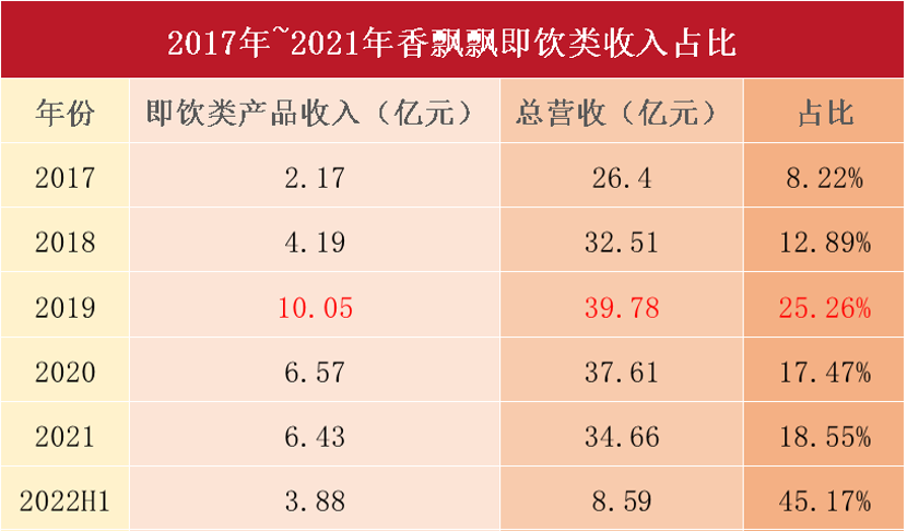 上市初期,即饮类产品确实为香飘飘带来了增长,2017~2019年,即饮类产品营收分别为2.17亿元、4.19亿元、10.05亿元,总营收占比从8%上升至25%。不过这样的成绩未能延续,到2020年,即饮类产品又遭遇大跌,连续两年营收下降。2021年年报显示,即饮类产品营收占比仅为18.55%,不足两成,未能担起香飘飘产品向上的重任。