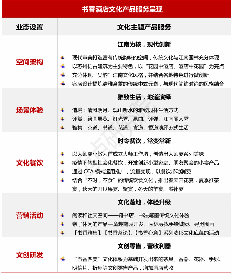 当前各酒店集团旗下文化酒店品牌正在通过以下路径提升自身竞争力,对酒店产品服务进行改造升级,成为行业市场热点。一是以地域文化、民族文化、特色文化等主题文化赋能,开拓文化体验和新消费空间,从而将酒店打造成为地标建筑、文化展示空间和文化特色的网红消费打卡地,如书香酒店集团旗下的苏州胥城大厦、苏州书香府邸·平江府、海南香水湾书香海景酒店均入围当地抖音种草榜,2021年开业的周庄书香府邸酒店,集中国绘画大系展览、自营书店(舟书店),自建园林于一体,成周庄新晋文旅标签。二是深入挖掘主题文化内涵,使主题与个性化服务相融合,让客群参与到文化主题的互动中,如华里酒店对礼仪文化的呈现不仅仅停留在概念和设计风格上,更是落地化为可被宾客感知的生活方式与内心体会。三是通过打造自身独特品牌服务,提高文化酒店的影响力,增加对高奢、小众、细分客群的吸引力,如倡导禅修体验的禅驿酒店和隐世修身的庐境酒店。