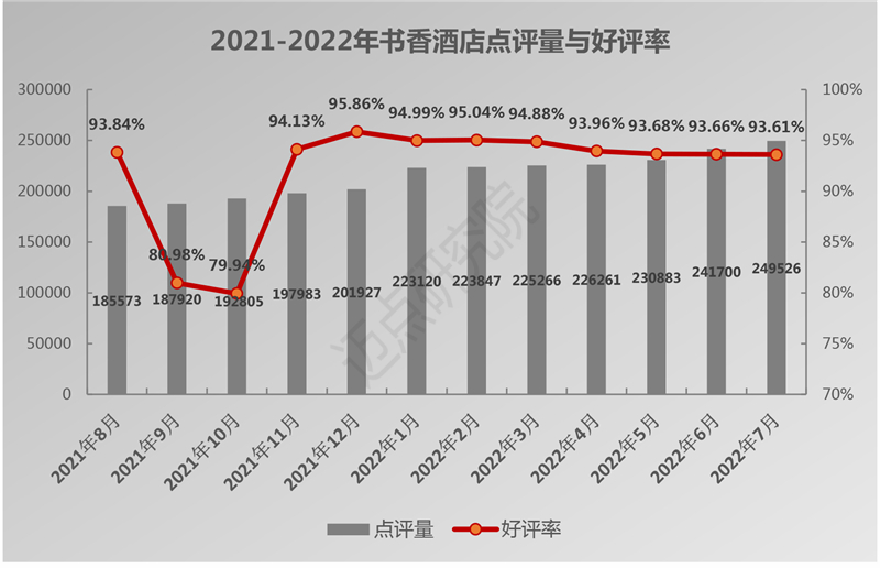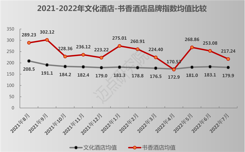 从近一年文化主题酒店品牌指数波动来看,品牌指数从200左右下降到180左右。其中,受2022年上半年疫情影响,品牌指数低位徘徊,但从5月开始回升。值得关注的是,疫情之下,书香酒店作为文化主题赛道的标杆品牌,抗风险以及盈利能力优势凸显,品牌影响力持续精进提升,品牌均值始终在220-300之间,2022年4月虽然有所回落,5月呈现出较快上升态势。