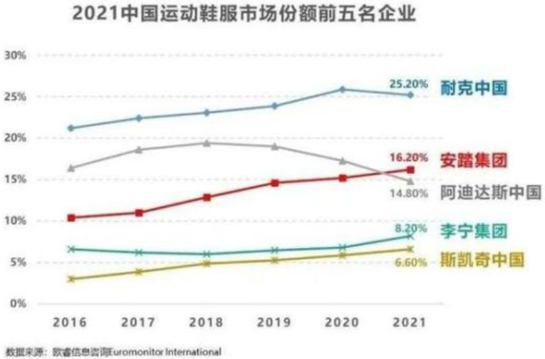 2021年,快速崛起的安踏集团迎来了业绩的爆发,营收达到493.28亿,市场占有率上涨至16.2%(李宁市占率8.2%),连续10年保持本土品牌第一,在国内市场甚至超越了阿迪达斯,仅次于耐克。2021年其经营利润首次突破100亿元大关(总约109.89亿,是李宁的2.2倍、特步的近5倍)。
