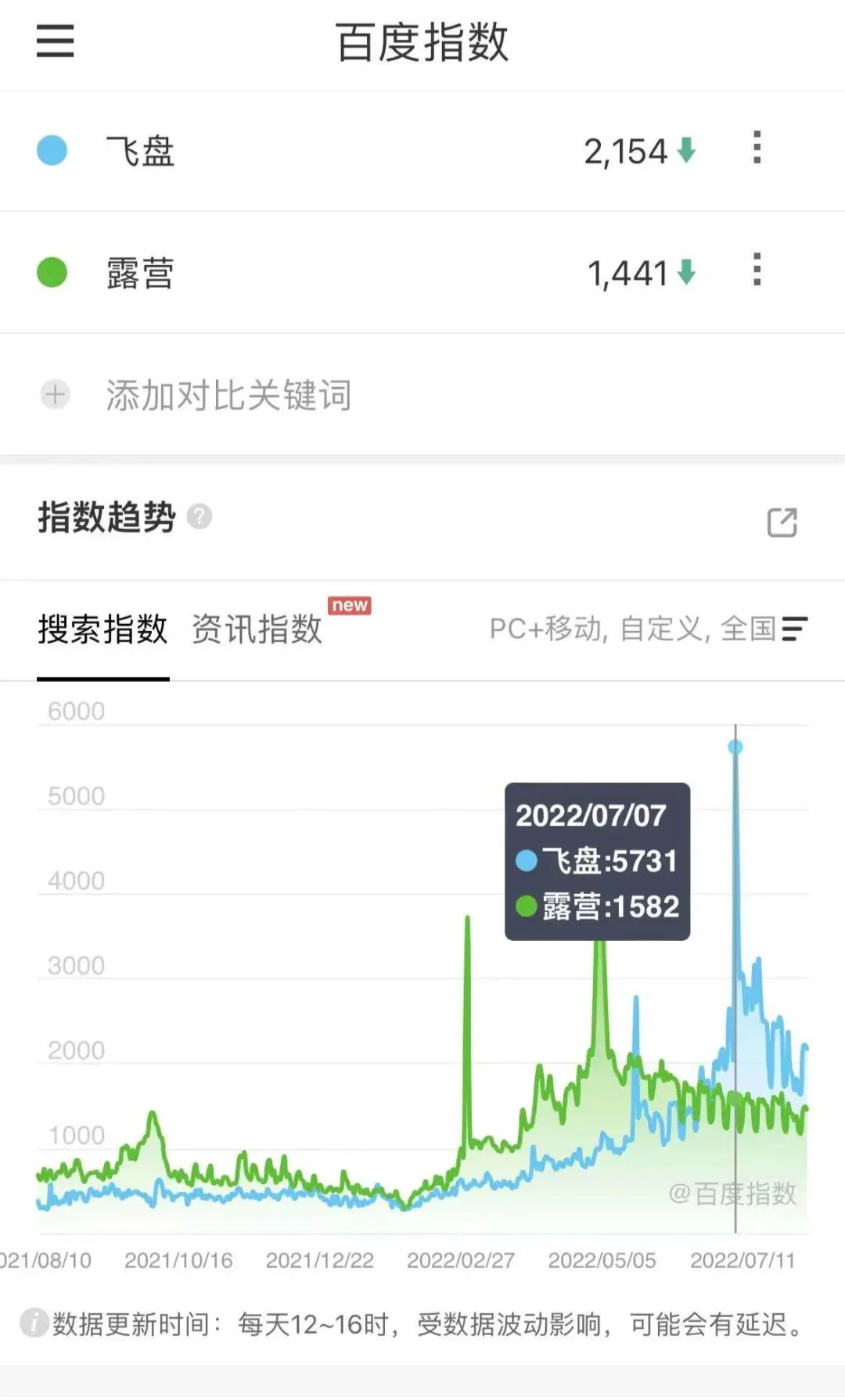 百度指数显示,在1年前的8月11日,飞盘和露营的搜索数据分别为298和628。而到了今年,露营和飞盘的搜索小高峰分别达到了4125和5731,与去年8月相比分别增长了556.8%和1800%。