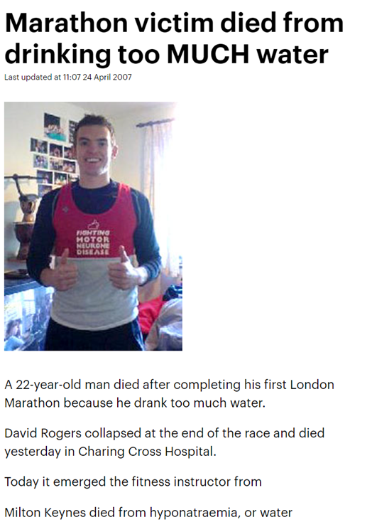 - [6]Marathon victim died from drinking too MUCH water https://www.dailymail.co.uk/news/article-450341/Marathon-victim-died-drinking-MUCH-water.html