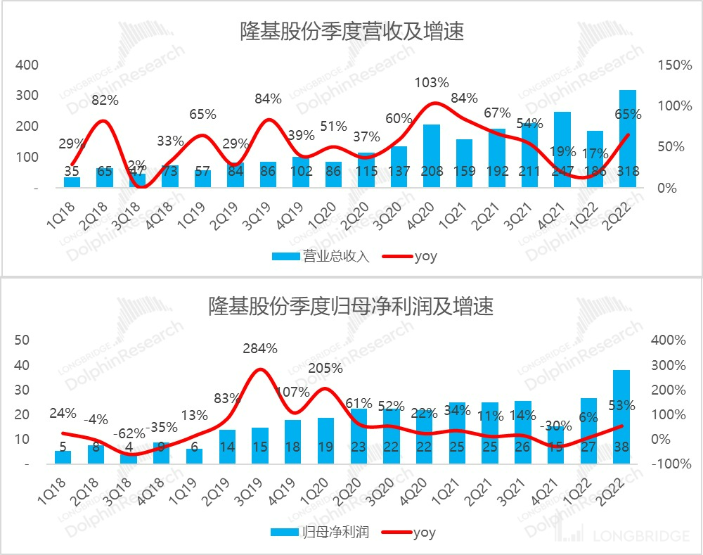 2022 年上半年公司营收 504 亿,同比增长 44%,与 7 月下旬业绩预告中的 “500 亿元-510 亿元之间,同比增长 42%-45%” 区间基本一致;归母利润接近 69 亿,同比增长 30%,稍超了公司的指引区间 “63 亿元-66 亿元之间,同比增长 26%-32%”。