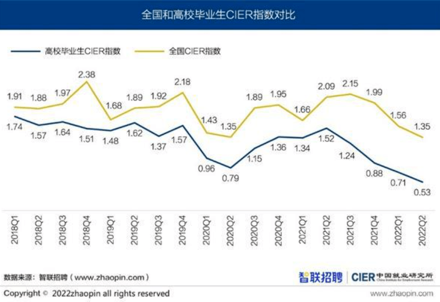 结构性存在着人才缺口,但不愿下一线的「一张白纸」们仍然存在着就业困难。智联招聘发布的《2022 年二季度高校毕业生就业市场景气报告》中显示,高校毕业生 CIER 指数(高校毕业生就业市场景气指数)今年二季度为 0.53,已连续第四个季度下降,达到历史最低值,高校毕业生就业签约率不足 50%,其中,专科毕业生拿到 offer 的人数占比达 48%,高于普通本科生的 42.8%。