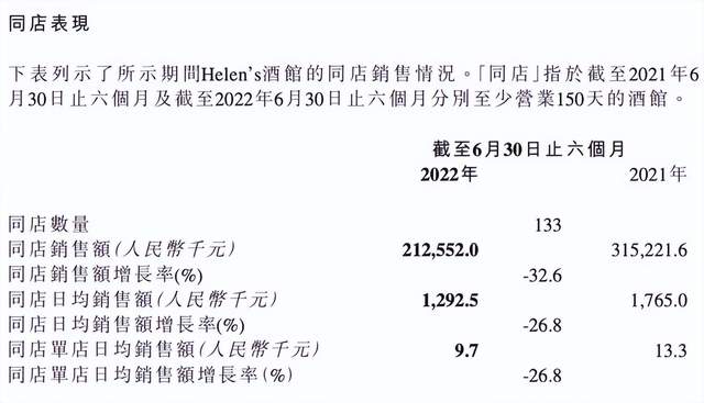 海伦司酒馆同店表现 图源 / 海伦司2022年中期业绩报告