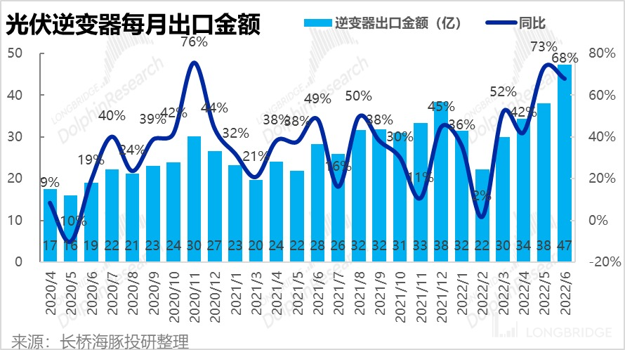 而且,不仅国内光伏装机强劲,二季度以来海外对逆变器的需求也在暴增,据统计 5-6 月份国内出口逆变器金额同比增速也由先前的 50% 左右,大幅提升到 70% 的水平。