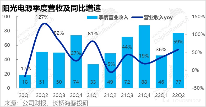 1、海内外需求共振下,二季度营收增长喜人:22 年一二季度国内光伏抢装势头明显,机量同比增速都在 140% 左右,今年上半年装机量比去年 1-9 月装机量还多 19%。此外,二季度海外对逆变器的需求也在暴增,5-6 月份中国逆变器出口金额增速由先前的 50%,大幅提升到 70% 以上。因此,在强劲需求驱动下,二季度公司实现营收 77 亿元,在疫情影响下,增速逆势提升到 59%,再创增速新高。
