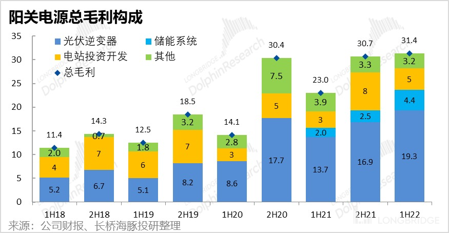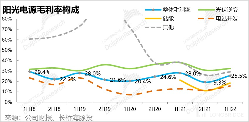 1)从业务机构上,虽然各业务毛利率普遍下行,但由于毛利率最高的光伏逆变器占比提升(贡献了约 2/3 的毛利润),因此公司整体毛利率的下滑程度相对较小。