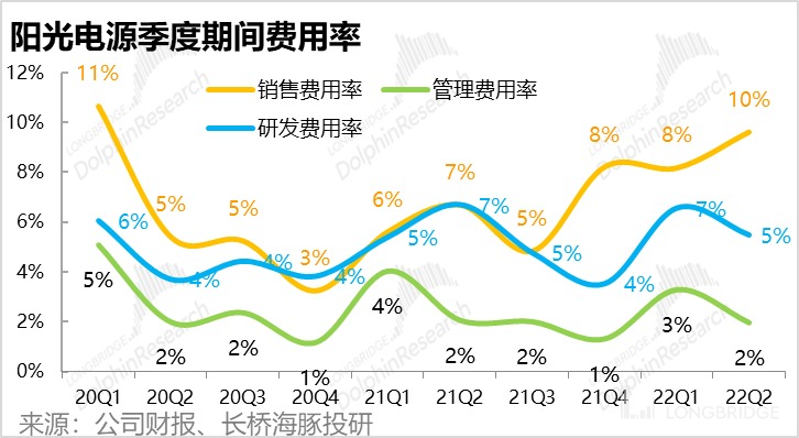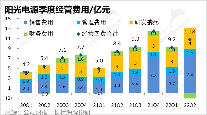 3、竞争加剧对应营销费用大涨,其他费用则平稳增长:对应毛利下滑暗示的竞争加剧,二季度营销费用大增 128%,占营收的比重也同比由 7% 增加到 10%,不过研发费用率却则由 7% 下降到 5%。背后的逻辑是:逆变器的品牌效应较强,用户在售后、维修,品牌、渠道等方面感知较强,而逆变器技术迭代却较慢,难以形成显著技术差距。因此在营销费用的投入(而非研发费用)是公司最易见效的竞争手段。