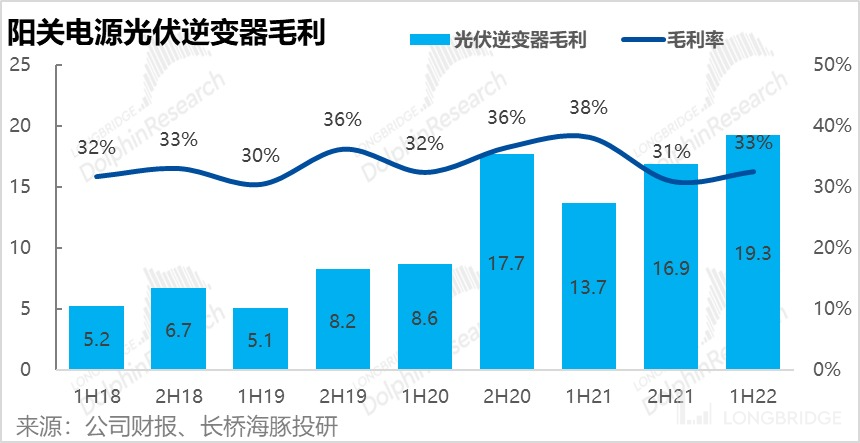 但是,逆变器业务也存在增收不增利的问题,今年上半年光伏逆变器业务的毛利率同比由 38% 大幅缩窄 5pct 到 33%。实现毛利润 31.4 亿,同比仅增长 36%。