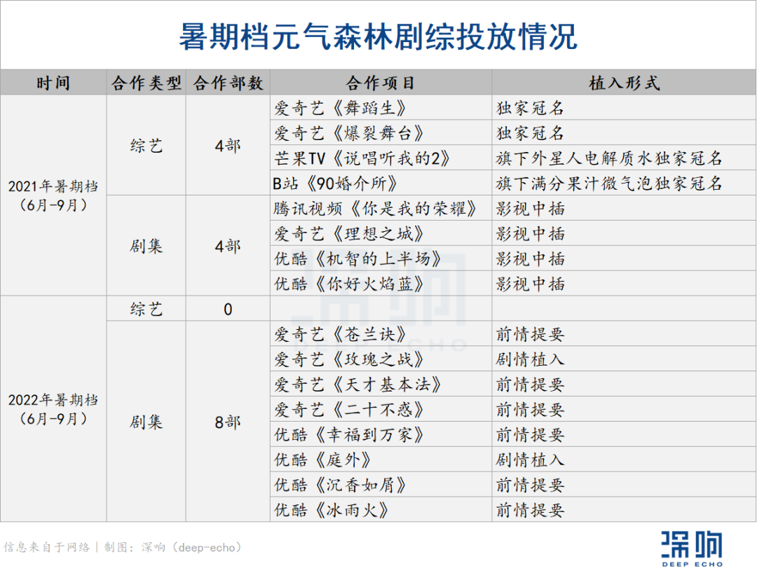据「深响」统计,2021年暑期档,元气森林分别植入了四档综艺、四部剧集,爱优腾芒B“雨露均沾”;到了今年暑期档,综艺一档未投,反而以剧情植入+后期硬广的方式合作了八部剧集,这八部剧集来自于爱奇艺与优酷。