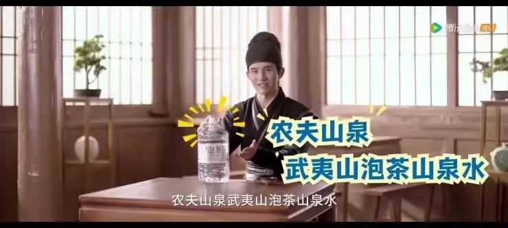比如《梦华录》的片尾推出了“你好!宋潮”小剧场,片中顾千帆的皇城司侍从陈廉通过讲述“宋朝人生活那些事”,不动声色地将现代品牌植入进去,成为了诸多品牌投放的热门场域。在与农夫山泉的合作中,陈廉先是借助“咖啡馆不如下午茶”的主题聊到宋朝人钟爱喝茶的习惯,随后拿出农夫山泉武夷山泡茶山泉水,品牌自然镶嵌其中。