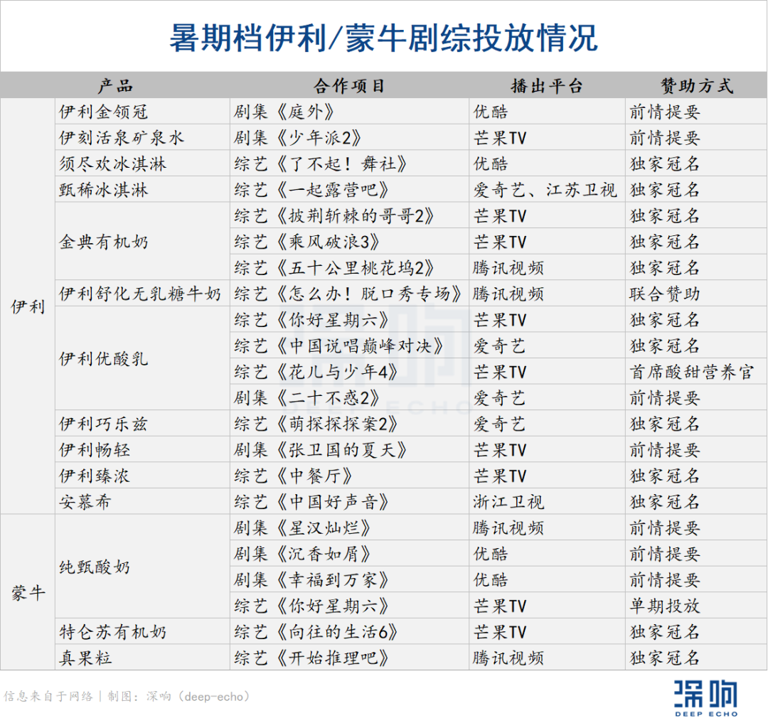 乳品品牌伊利和蒙牛就是典型的例子,旗下的产品安慕希与纯甄,均是靠剧综赞助打出了声量。再复盘今年暑期档的剧综招商情况,伊利有11款产品以不同的形式出现在了剧集、综艺里,蒙牛在剧综中植入了三款不同的产品。多样的产品线需要更多的曝光度,而不同的产品调性也能去适配不同类型的剧综。
