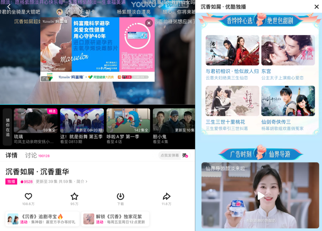 暑期档另一部古装大剧《沉香如屑》也展现出了与30多个品牌“玩在一起”的新姿势。比如联合必胜客推出了弹幕互动包的新植入玩法,观众可以使用品牌贴纸、表情包在弹幕区互动;此外,深度挖掘IP价值,满足剧粉、演员粉们更私人定制化的需求,《沉香如屑》的播放页下方衍生出了“《沉香》追剧寻宝”和“解锁《沉香》独家花絮”两个营销专区,前者是以剧版的官方周边为主,后者则是打包售卖花絮等官方数字限定集,而纯甄也借助代言人杨紫的身份在其中实现了深度曝光。