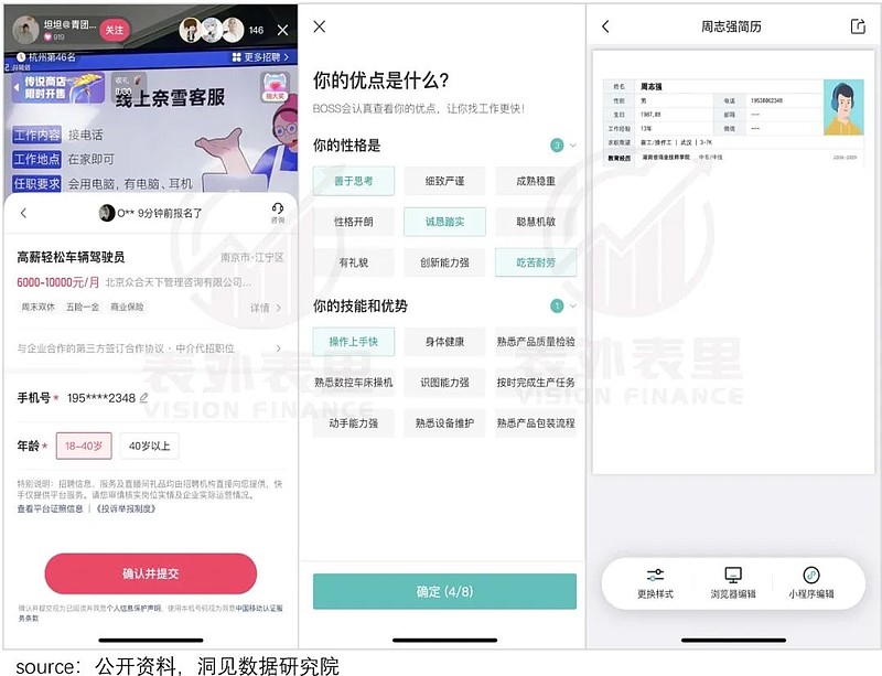 如此看来,BOSS直聘更偏向“先建立信任、再提升流量”,快手则是“流量监督下,建立信任”模式。而缩短交易链条或意义更大,但长期实现难度,不会比“贝壳”那种革命房产中介的小。