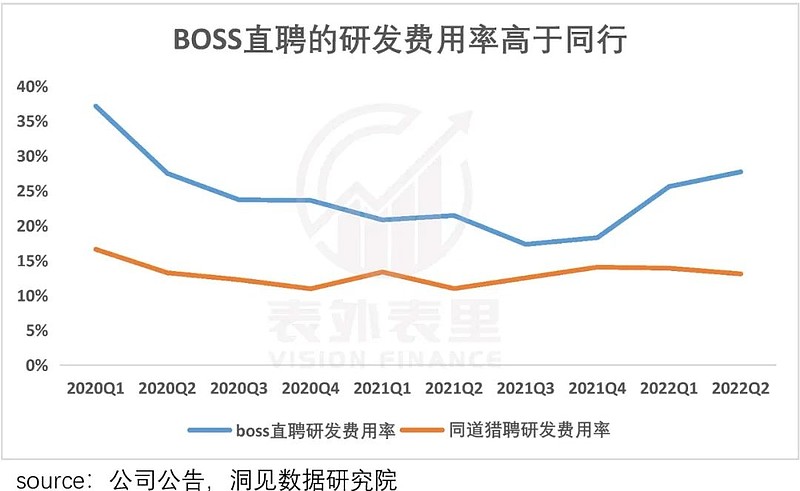 基于此,BOSS直聘砸了不少钱做技术。如下图,其研发费率比同行,明显高出不少。