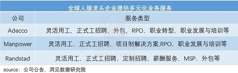 而除了灵活用工,这些全球领先的劳务龙头机构,还会为客户提供一站式服务——招聘前、招聘中、招聘后全流程参与服务。这意味着,整体解决方案提供商模式也会是行业发展趋势。
