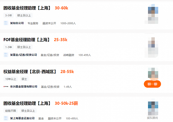 在猎聘网站上,搜索基金经理这一关键词,界面新闻记者看到,除了少数两三个权益基金经理的职位外,其余多是基金经理助理等职位。薪资待遇显示,每个月的固定薪酬在3-6万之间。