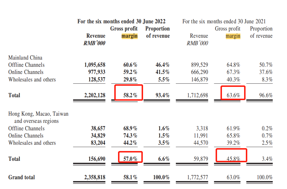 另一点值得关注的是,相较于去年同期中国大陆与出海业务毛利率有将近 20% 的差距(国内毛利率 63.6% vs 海外毛利率 45.8%),2022 上半年,中国大陆的各销售渠道毛利率都有所下降,相对地出海业务各渠道毛利率都在上升。截至 2022 年 6 月 30 日,泡泡玛特中国大陆业务的毛利率下降为 58.2%,出海业务毛利率为 57.0%,相差不大。