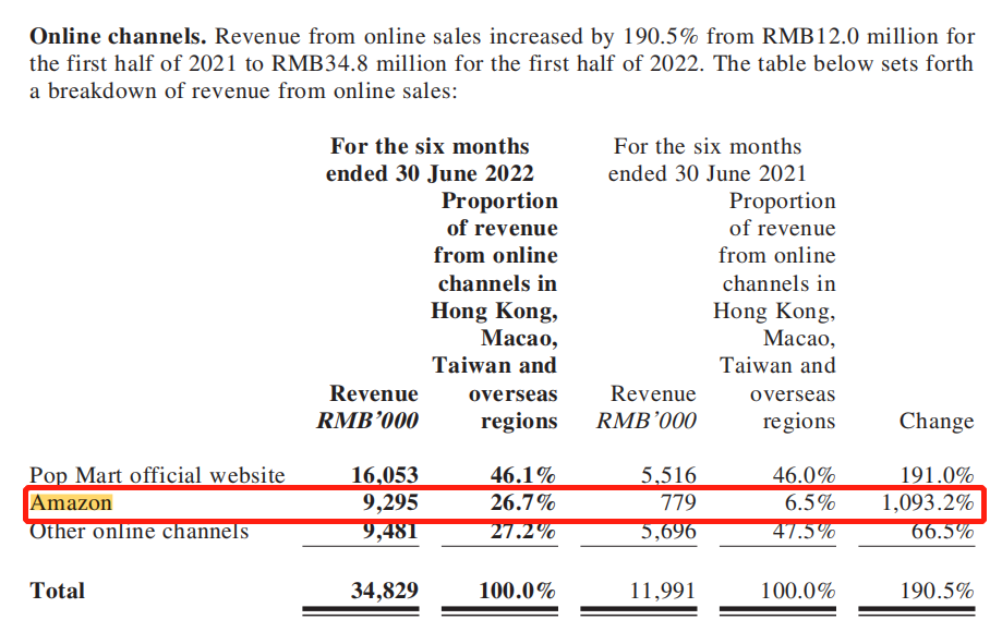 出海业务占泡泡玛特总营收的不到 7%,但同比来看,出海业务营收有较为明显上升。中期业绩报告显示,泡泡玛特上半年出海线下业务营收高于线下,其中线下门店营收实现 3479 万元,同比增长了 1277.4%,占线下业务的 90%。而在出海线上业务中,营收主要来源于泡泡玛特海外官方网站,占线上总营收的 46.1%。其余的线上营收主要来自 Amazon,且 Amazon 渠道贡献的营收增长明显,从 2021 上半年的 77.9 万元增长至 929.5 万。