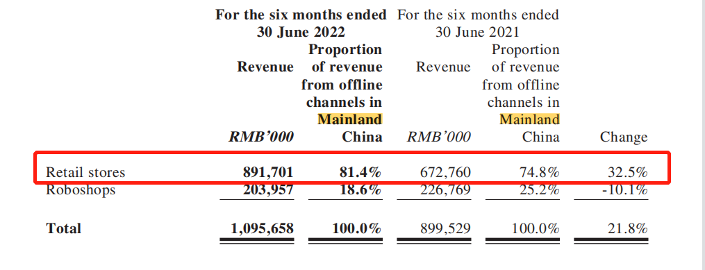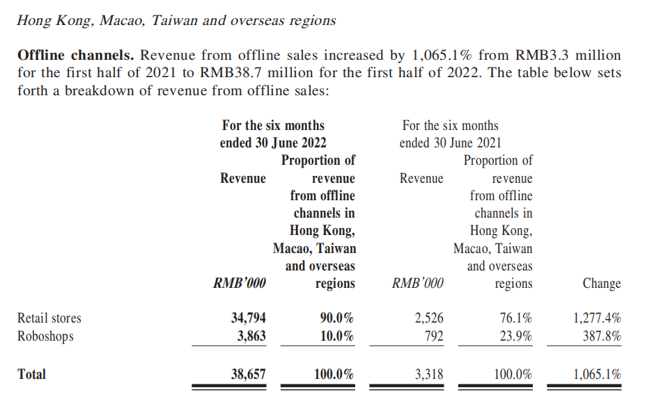 在总营收中,中国大陆的营收为 22.02 亿元,约占 93.3%,剩下不到 7% 的营收由中国港澳台以及海外市场共同贡献,实现了 1.57 亿元,同比上升 161.67%。在这些出海市场,来自批发的营收占掉了一半多,也保持着不错的增速,同比上升约 86.68%。相较之下线下零售和线上的总营收虽然不及批发占比高,但增速更快,比 2021 年同期增长了 380%。