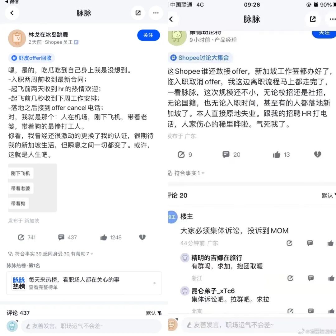脉脉从周五开始被一则帖子引爆:刚下飞机,全家连人带狗都到了新加坡,收到了新公司 offer 取消的消息。