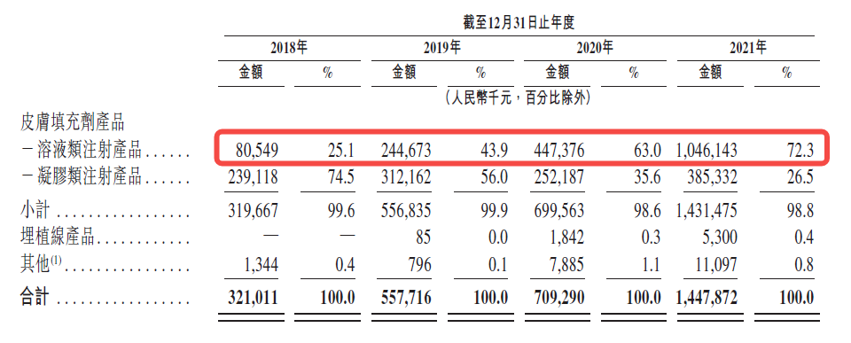 目前爱美客共有在售产品7款,包括溶液类皮肤填充剂、凝胶类皮肤填充剂和埋植线产品,其中以嗨体为核心的溶液类注射产品的大幅增长,支撑起爱美客业绩的整体增长。数据显示,2018-2021年,溶液类注射产品收入占比从25.1%提升至72.3%。